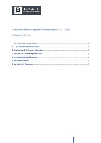 1Checkliste: Einf%u00fchrung der E-Rechnung ab 01.01.2025InhaltsverzeichnisWas Sie dar%u00fcber wissen sollten........................................................................................................... 01. Grad der Betroffenheit pr%u00fcfen ....................................................................................................... 22. Empfang der E-Rechnung vorbereiten............................................................................................... 33. Versand der E-Rechnung vorbereiten................................................................................................ 44. Organisatorische Ma%u00dfnahmen........................................................................................................... 55. Rechtliche Aspekte ............................................................................................................................. 66. Vorteile der E-Rechnung..................................................................................................................... 7