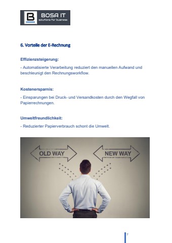 76. Vorteile der E-RechnungEffizienzsteigerung:- Automatisierte Verarbeitung reduziert den manuellen Aufwand und beschleunigt den Rechnungsworkflow.Kostenersparnis:- Einsparungen bei Druck- und Versandkosten durch den Wegfall von Papierrechnungen.Umweltfreundlichkeit:- Reduzierter Papierverbrauch schont die Umwelt.